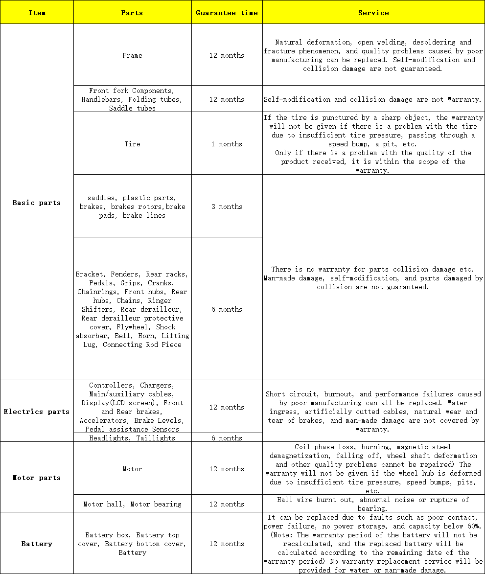 The warranty period for ebikes is as follows. If the customer finds non-human damage within the warranty period, we will send the replacement parts free of charge.